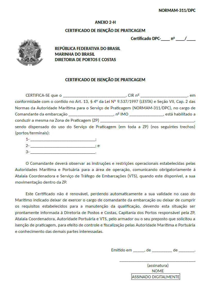 dispensa do Serviço de Praticagem será concedida pela CP).